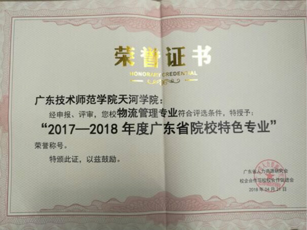 4月21日,由广东省人力资源研究会、广东省校企合作与校校合作促进会、《中学生报》、广东教育杂志社、广东电视台、广州日报社、广东省生涯教育研究院、广东校园人才网等联合举办的广东省院校招生、就业、校企合作优秀管理者表彰大会和特色专业发布会在天河人才港隆重举行。会上我校工商管理学院物流管理专业被评为“广东省院校特色专业”。