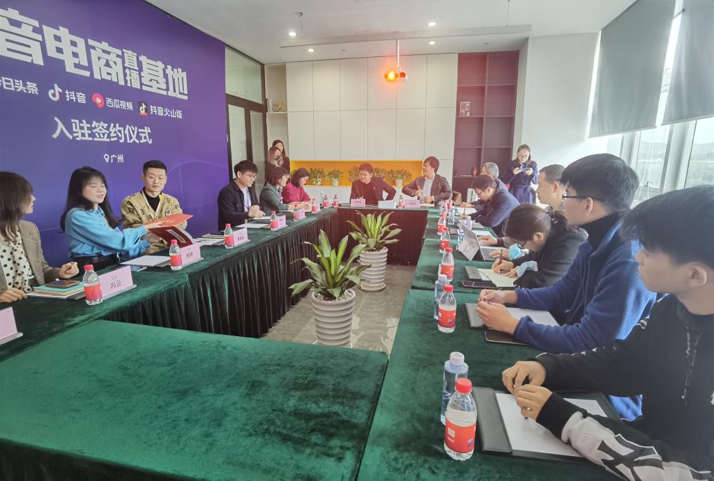 一行人员参观抖音电商直播基地,校领导和协会会长刘俊禄及相关企业洽谈校企合作。交流会上,伏焕昌常务副校长从学校概况、人才培养、合作交流、产教融合等方面做了详细介绍,对学校规划发展的冷链物流产业园、化妆品电商直播基地做了重点介绍。刘俊禄会长从协会成立、发展情况、行业要求、服务对象、服务内容等方面对广州市美容化妆品电子商务行业协会作了详细介绍。双方就规划合作、产业优势互补、人才培养等方面展开了深入探讨和交流,初步达成了行业人才输送、开展产教融合的合作意向,为增进下一步校行企合作打下了良好基础。