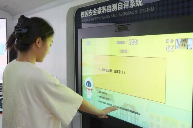 移动宣教车体验区外形似大巴,但内里别有洞天,配备了多个应急安全宣教多媒体互动设备,宣传内容包括校园宿舍安全、校园实验室安全、校园食品安全、抵制校园暴力、防止校园意外伤害、校园安全素养自测自评、4D火灾逃生演练等,通过游戏和测试等方式呈现校园内可能存在的安全隐患。