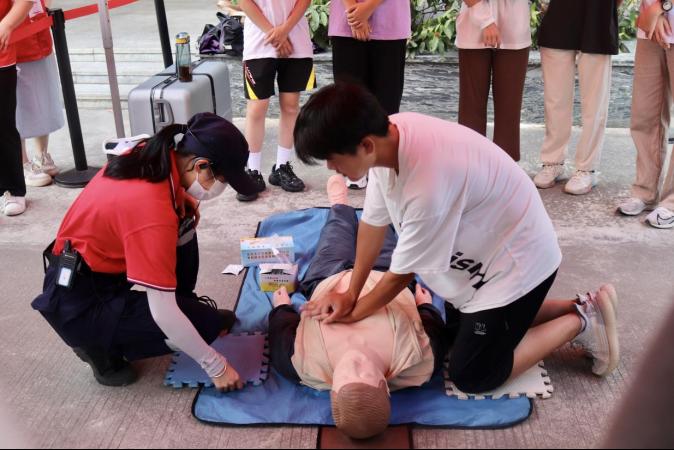 在大巴车外的心肺复苏体验区中,宣教员还用假人示范心肺复苏的正确手势和要领,直观地向师生普及了海姆立克急救法的注意事项,带领师生沉浸式体验应急救援。
