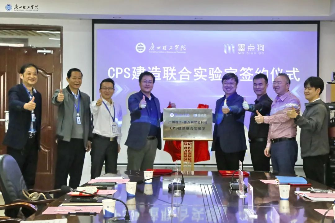 在与会人员见证下,伏焕昌与赵祺代表双方签订校企合作协议,共同为“suncitygroup太阳新城——墨点狗智能科技CPS建造联合实验室”揭牌。