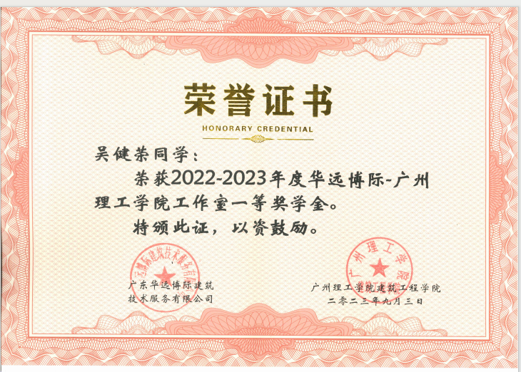 吴健荣同学获得一等奖学金