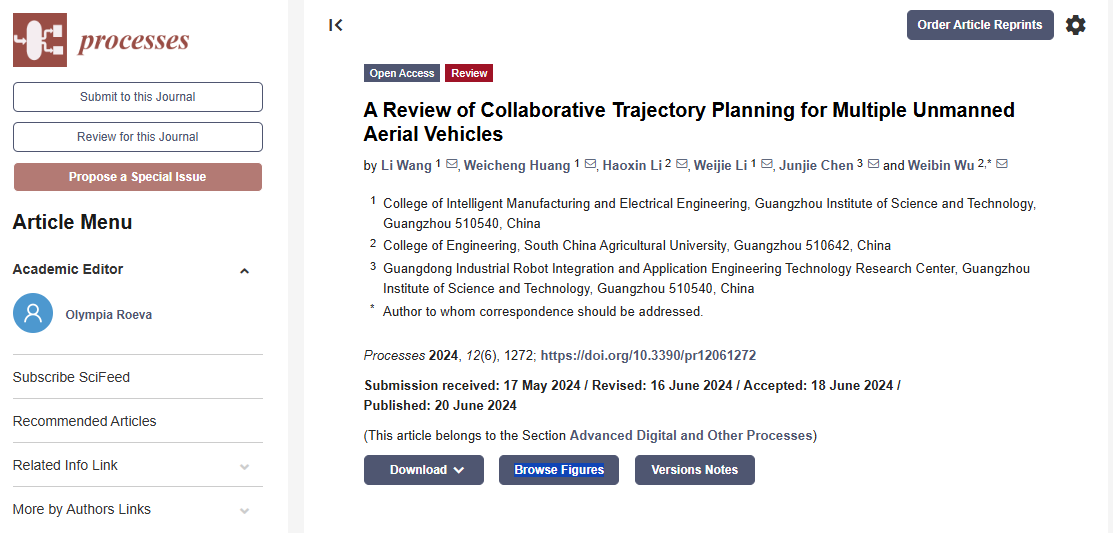 (李嘉嘉 沈泽婷)近日,我校智能制造与电气工程学院21级机器人专业黄炜程同学(共同第一作者)在名师工作室汪理老师指导下,在SCI期刊《PROCESSES》发表研究论文《A Review of Collaborative Trajectory Planning for Multiple Unmanned Aerial Vehicles 》。