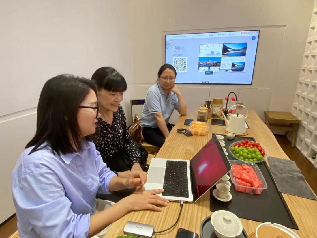图2 张丽女士向尚华院长和安陆禄老师介绍企业的创办理念
