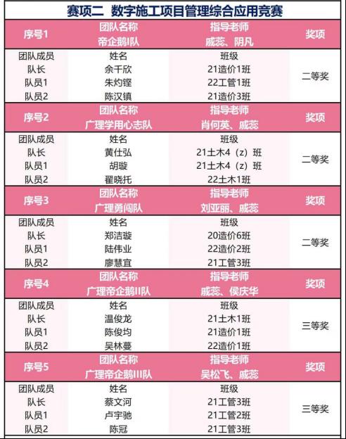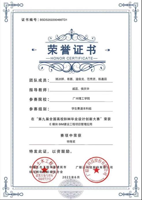 在第十届全国毕业设计创新大赛中,我工作室队伍帝企鹅A1队荣获A模块施工BIM建模与应用二等奖,广理帝企鹅E1队荣获E模块BIM建设工程项目管理应用二等奖,广理帝企鹅队荣获E模块BIM建设工程项目管理应用三等奖,帝企鹅E2队荣获E模块BIM建设工程项目管理应用三等奖。