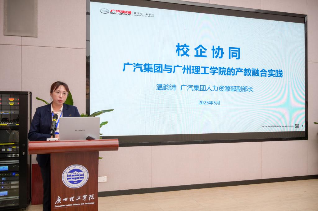 广汽集团人力资源部副部长温韵诗分享了与学校的产教融合实践。双方自 2023 年合作以来,构建了全方位管理制度体系,取得显著成果。硬件方面,捐赠新能源教学车并共建实验室;人才培养上,设立奖学金、实施双导师制,联合指导论文;区域赋能方面,推动产业链与人才链融合,带动惠州新能源汽车产业链产值增长。