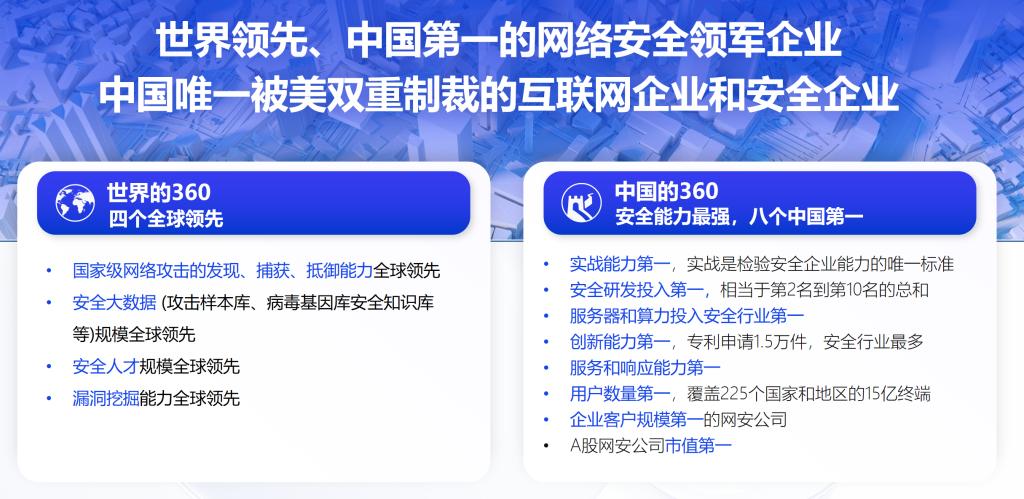 360集团成立于2005年,经过20年的发展和积累,已拥有四个“全球领先”优势,包括:360发现和抵御国家级黑客攻击能力全球领先;360拥有的安全大数据规模全球领先,有攻击样本超340亿;360的漏洞挖掘能力全球领先;此外,360也是全球最大的安全人才平台,拥有全球最强白帽子军团。