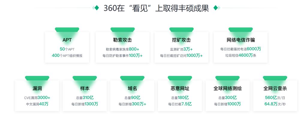 截至目前,360累计捕获50余个境外APT组织,监测到6200多次对我国20000多家重要机构单位的高级网络攻击事件;360数字安全中国方案已落地超20个大中型城市,涵盖四大直辖市和部分省会城市,树立了标志性的城市级安全服务典范;同时,覆盖了超过90%的中央部委、80%央企、95%大型金融机构和100%的运营商,累计服务超10000家政企客户。